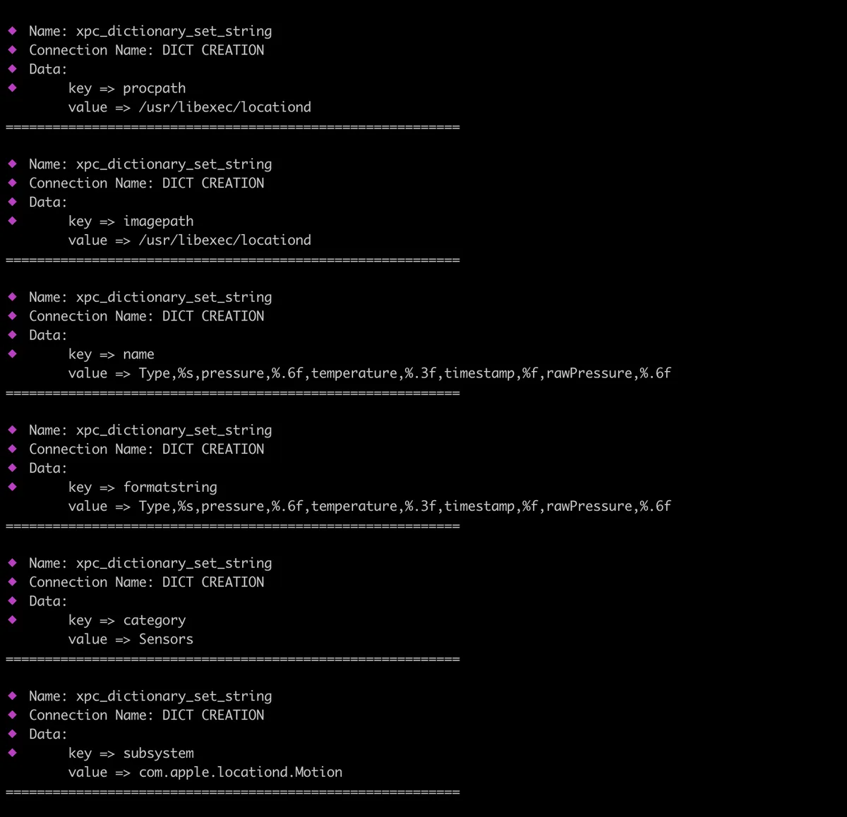 We can see that we have found the match inside the bplist17 which is sent using xpc_connection_send_notification function. The data contains a lot of useful information, such as longitude, latitude, accuracy, etc.