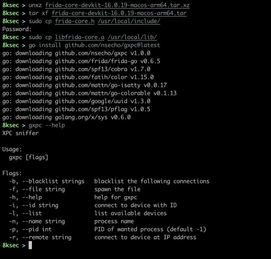 As with frida-go, gxpc supports macOS, Linux and Android. We will use macOS as a host machine. We first need to install go and download frida-core-devkit for our machine.