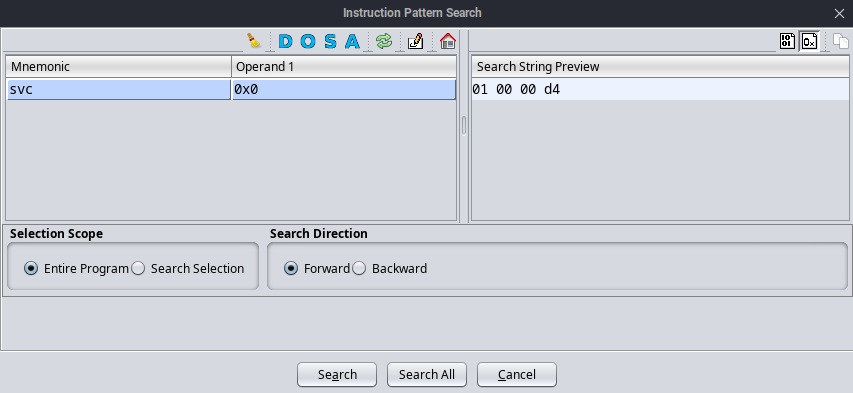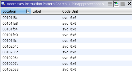 To attach the Frida interceptor on all these SVC instructions, we first need to find out the offsets where all these instructions are present. We can do this easily with the help of Ghidra search instruction pattern feature.