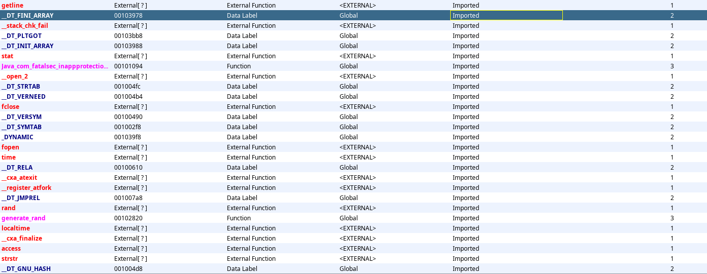 In the strings listed, we do have zygote present. Next we have to figure out the function responsible for doing this string comparison. Let’s head back to the imported functions in Ghidra: