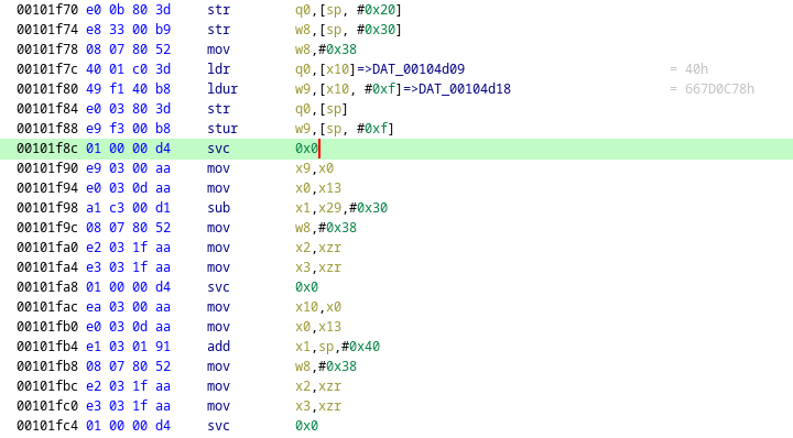 These instructions are used to call functions using system call number. Since we are dealing with Arm64 binary let’s open up the system call mapping table for this architecture. You can find a complete list of syscalls here: https://chromium.googlesource.com/chromiumos/docs/+/master/constants/syscalls.md#arm64-64_bit