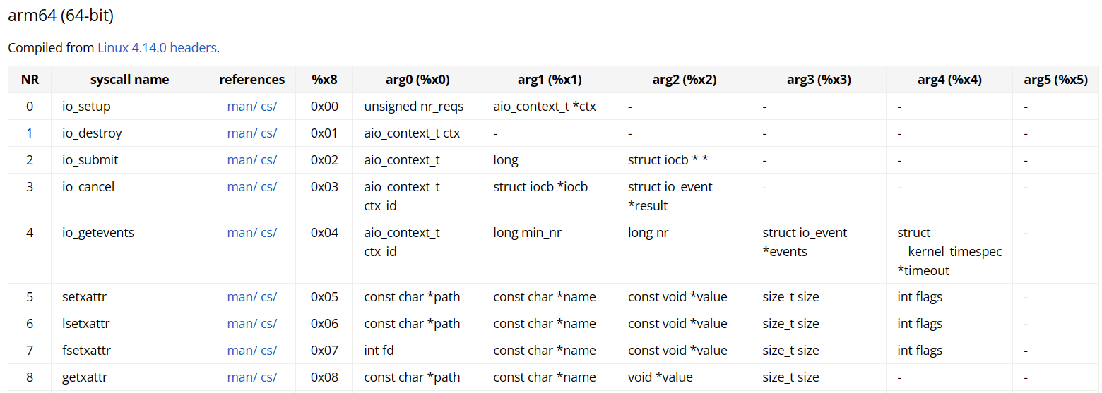 In this first column we have the name of the function, then in the 3rd column we have system call number and as specified here it gets stored in X8 register and then the arguments to the functions will be stored in registers starting from X0 to X5. Let’s analyze this in the disassembly we just saw:
