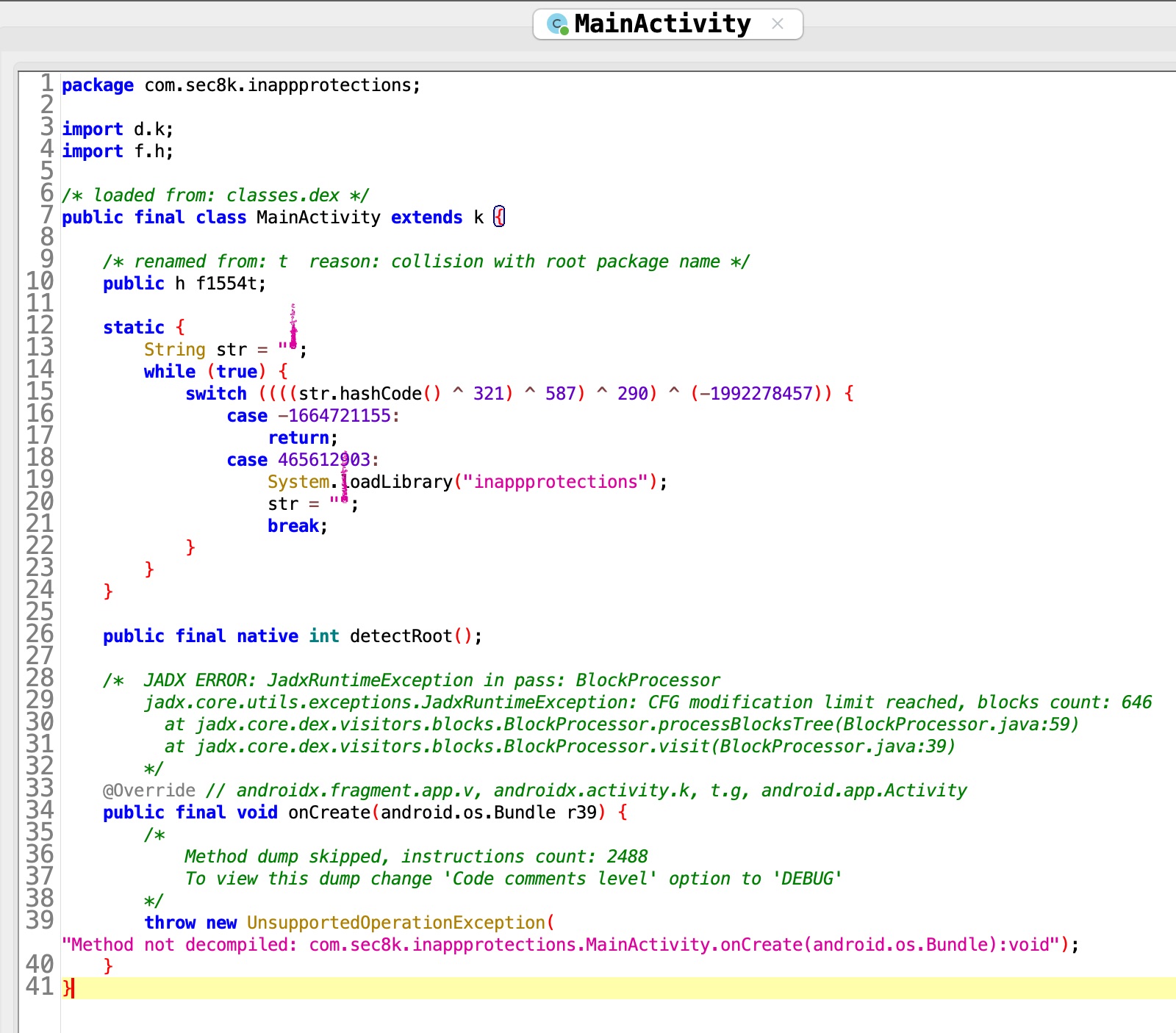 It seems that MainActivity has a static block where it is calling System.loadLibrary("inappprotections") which is responsible for loading the native library into the memory.