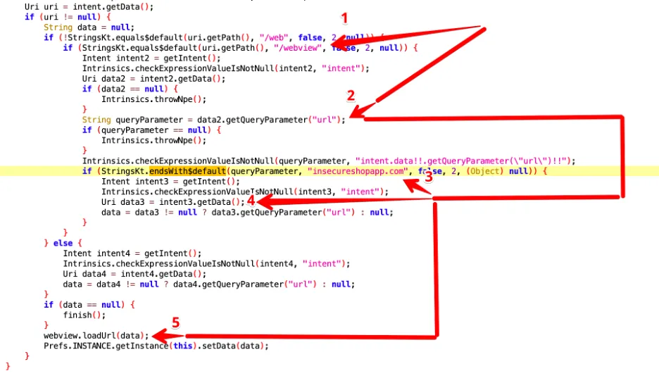 Mitigation: Make sure to verify the authority and not just the domain name that the URL ends with. On devices with API level 1-24 (up to Android 7.0), android.net.Uri and java.net.URL parsers work incorrectly. Example: String url = "8ksec.io\\@insecureshopapp.com"; — This will load the 8ksec.io webpage. Make sure to throw URISyntaxException if back-slashes are encountered in the request.