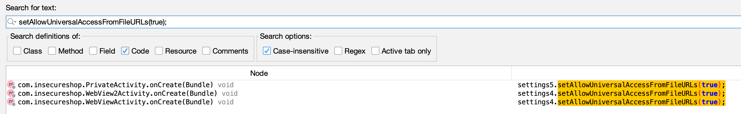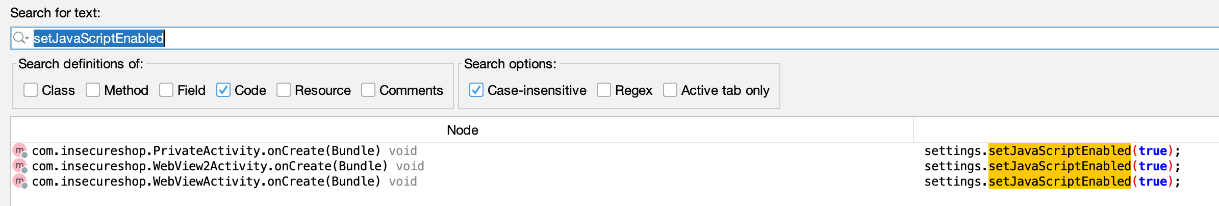 We used Jadx search to find the instances where this is located. These are the activities where we need to execute the Javascript which we can control and it will get triggered in the context of the insecureShop application.