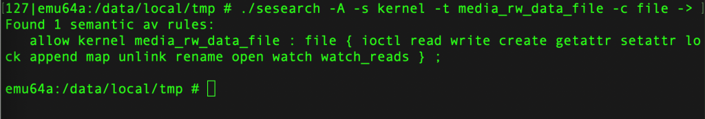 ./sesearch -A -s kernel -t media_rw_data_file -c file -p read /sys/fs/selinux/policy