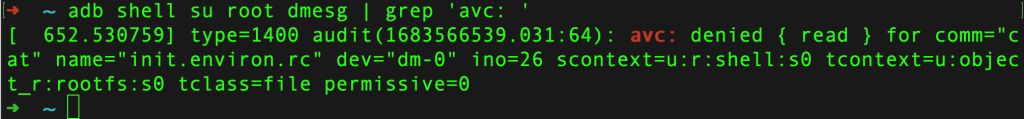 [ 652.530759] type=1400 audit(1683566539.031:64): avc: denied { read } for comm="cat" name="init.environ.rc" dev="dm-0" ino=26 scontext=u:r:shell:s0 tcontext=u:object_r:rootfs:s0 tclass=file permissive=0