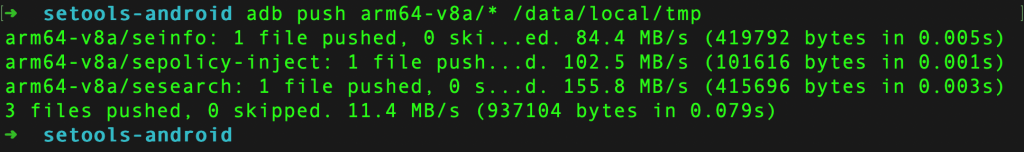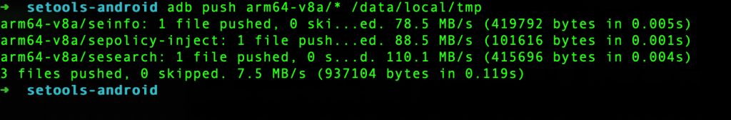 Download setools-android from https://github.com/xmikos/setools-android/releases and push the binaries to the device using the following commands (our device is an aarch64 device).