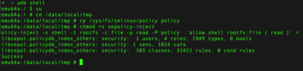 adb shell su cd /data/local/tmp cp /sys/fs/selinux/policy policy ./sepolicy-inject -s shell -t rootfs -c file -p read,open -P policy “allow shell rootfs:file { read open }” cp policy /sys/fs/selinux/policy