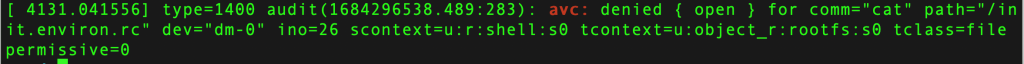 [ 4131.041556] type=1400 audit(1684296538.489:283): avc: denied { open } for comm=“cat” path=“/init.environ.rc” dev=“dm-0” ino=26 scontext=u:r:shell:s0 tcontext=u:object_r:rootfs:s0 tclass=file permissive=0