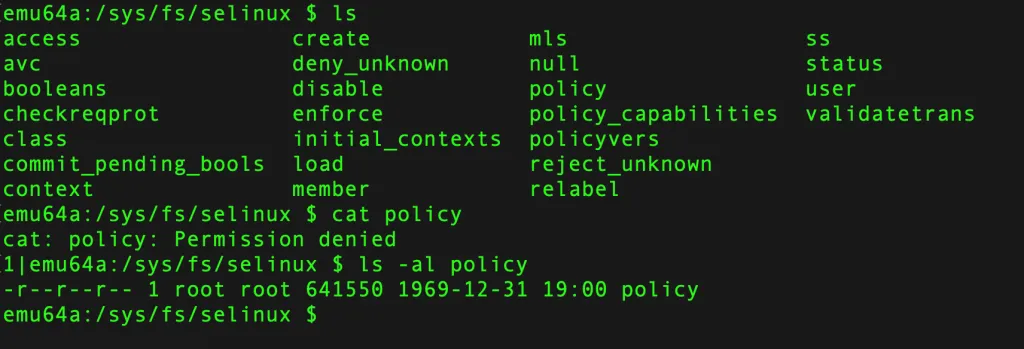 So in our case, the policy file will be in /sys/fs/selinux, and in a file as “policy” - **/sys/fs/selinux/policy**.