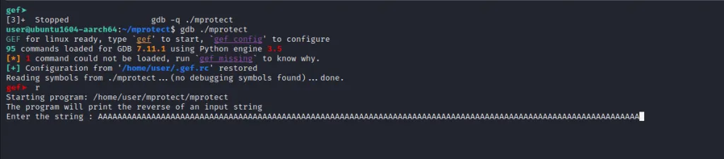 We can see our junk “A”s just above that. So we need again fill in some more “A” s to reach there and populate it with the address of mprotect() so that it will be loaded to x21**.