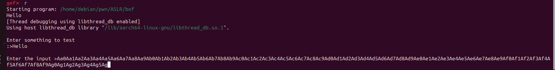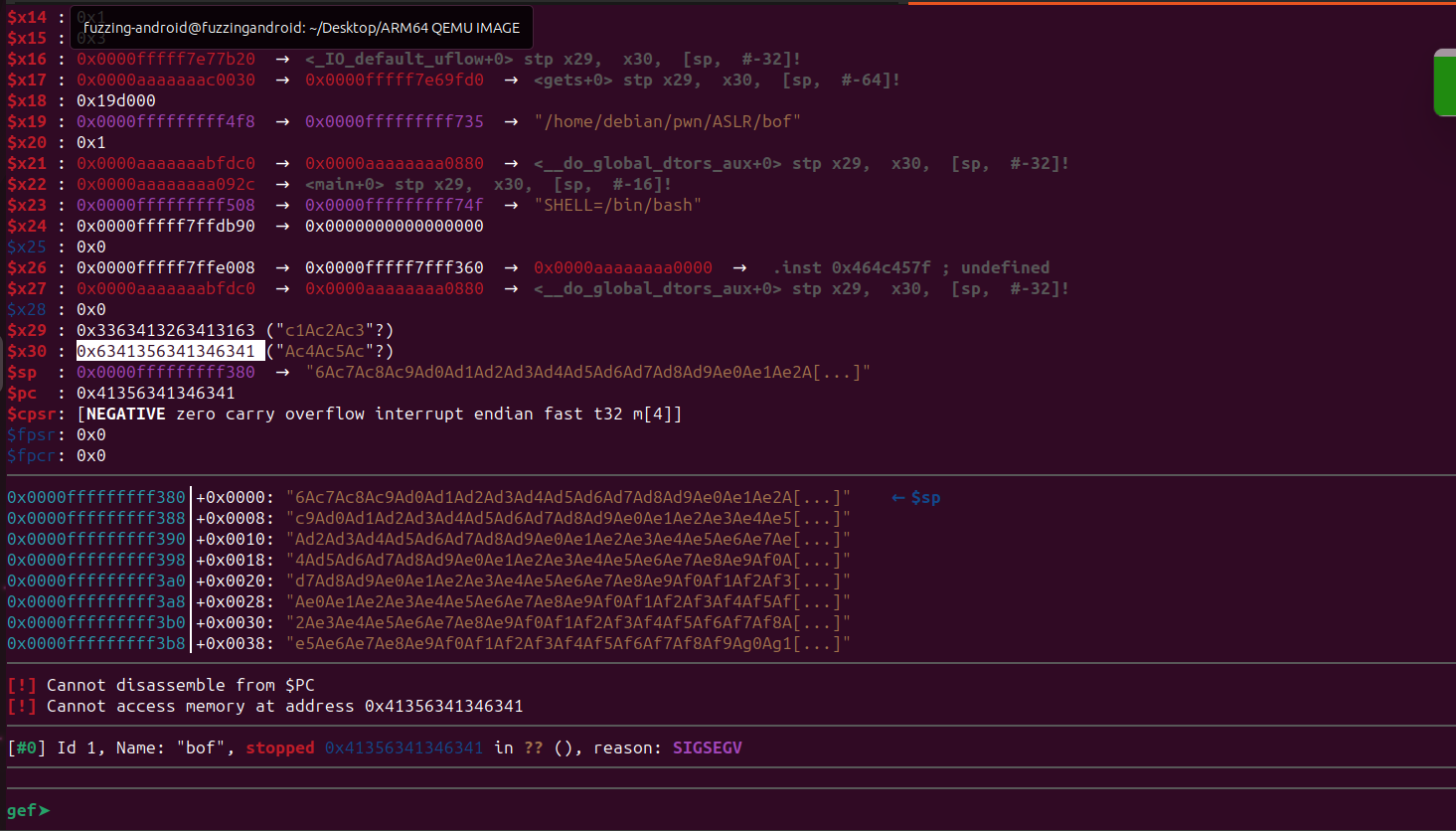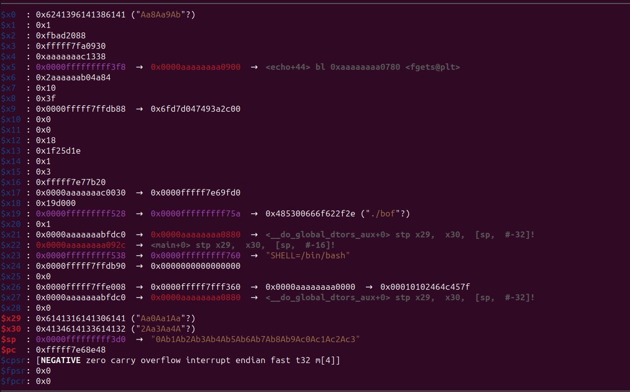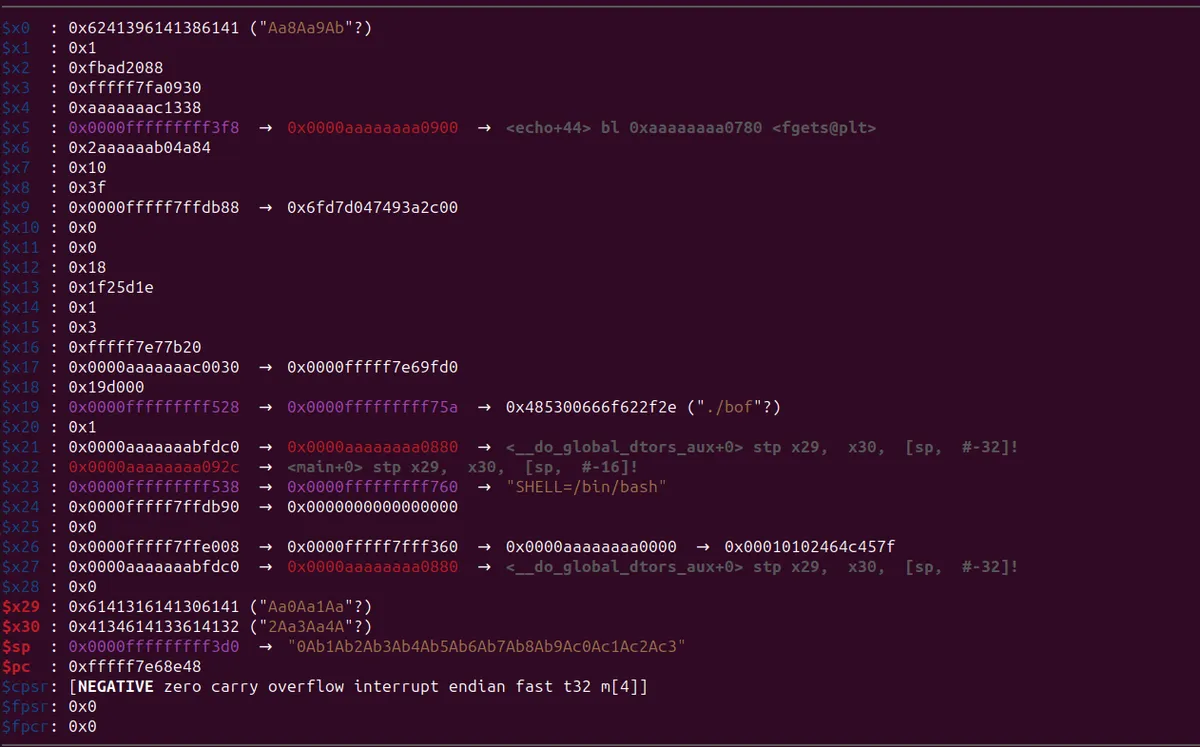 [ Legend: Code | Heap | Stack ] Start End Offset Perm Path 0x0000aaaaaaaa0000 0x0000aaaaaaaa1000 0x0000000000000000 r-x /home/debian/pwn/ASLR/bof 0x0000aaaaaaabf000 0x0000aaaaaaac0000 0x000000000000f000 r— /home/debian/pwn/ASLR/bof 0x0000aaaaaaac0000 0x0000aaaaaaac1000 0x0000000000010000 rw- /home/debian/pwn/ASLR/bof 0x0000fffff7e00000 0x0000fffff7f87000 0x0000000000000000 r-x /usr/lib/aarch64-linux-gnu/libc.so.6 0x0000fffff7f87000 0x0000fffff7f9d000 0x0000000000187000 --- /usr/lib/aarch64-linux-gnu/libc.so.6 0x0000fffff7f9d000 0x0000fffff7fa0000 0x000000000018d000 r— /usr/lib/aarch64-linux-gnu/libc.so.6 0x0000fffff7fa0000 0x0000fffff7fa2000 0x0000000000190000 rw- /usr/lib/aarch64-linux-gnu/libc.so.6 0x0000fffff7fa2000 0x0000fffff7faf000 0x0000000000000000 rw- 0x0000fffff7fbe000 0x0000fffff7fe4000 0x0000000000000000 r-x /usr/lib/aarch64-linux-gnu/ld-linux-aarch64.so.1 0x0000fffff7ff7000 0x0000fffff7ff9000 0x0000000000000000 rw- 0x0000fffff7ff9000 0x0000fffff7ffb000 0x0000000000000000 r— [vvar] 0x0000fffff7ffb000 0x0000fffff7ffc000 0x0000000000000000 r-x [vdso] 0x0000fffff7ffc000 0x0000fffff7ffe000 0x000000000002e000 r— /usr/lib/aarch64-linux-gnu/ld-linux-aarch64.so.1 0x0000fffff7ffe000 0x0000fffff8000000 0x0000000000030000 rw- /usr/lib/aarch64-linux-gnu/ld-linux-aarch64.so.1 0x0000fffffffdf000 0x0001000000000000 0x0000000000000000 rw- [stack] gef➤