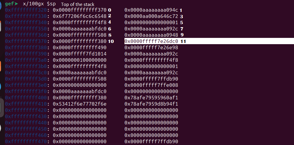For obtaining the leaked address from the libc, we need the exact position. Let’s calculate that. The first seven leaked values are the registers x1 to x7 , then it will start to leak the values from the stack. So the actual position will be,