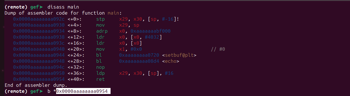 Now the remote debugging has been started. Let’s put a breakpoint at ret instruction of the echo() function.