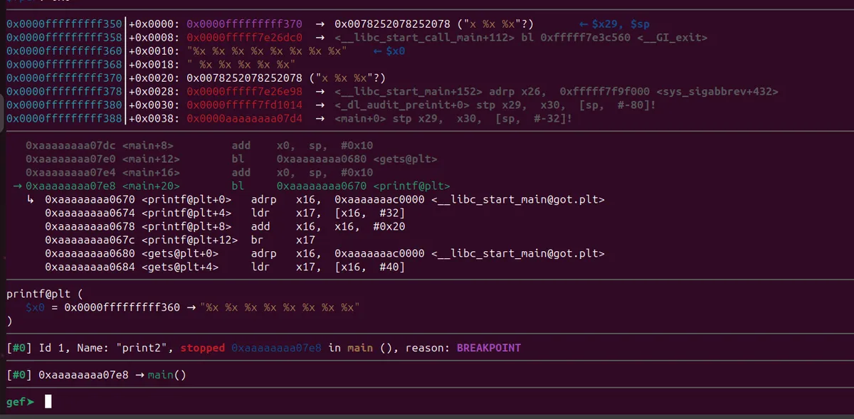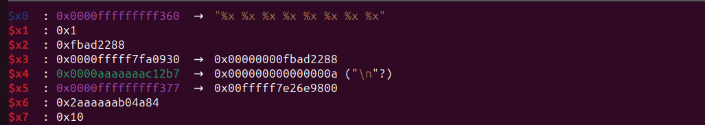 In this case, for the printf() function, the first argument will be the pointer to the format string. This pointer will be stored in the x0 register, while the remaining arguments, which represent the actual values, are passed through other registers.