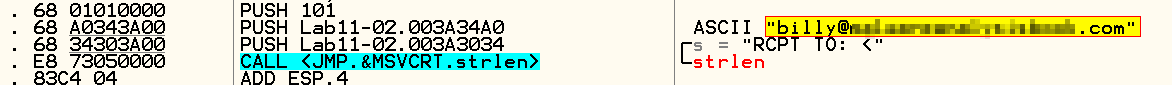 Considering that the call to this function occurred after hooking into the send function and modifying memory with the values ‘RCPT TO:’, we conclude that the malware will append the recently decoded email address to every email if it originates from one of the previously identified processes (OUTLOOK.EXE, MSIMN.EXE, THEBAT.EXE) that are responsible for Email Exchange services.