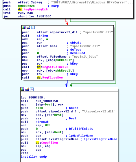 Then it calls the function RegSetValue in order to install itself in the mentioned Registry Key AppInit_DLLs.