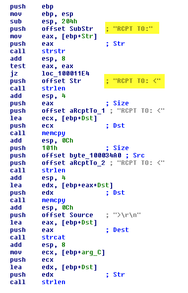 The malware actually writes to memory the value “RCPT TO” in addition to another value extracted from the *.ini configuration file we saw that apparently contains gibberish data.