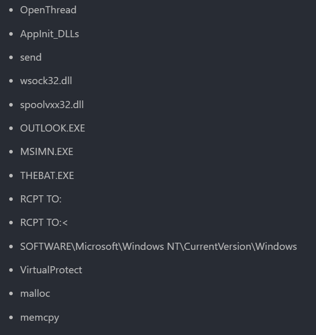 We see that the file is somehow related to email sending services due to the use of the strings: OUTLOOK.EXE, MSIMN.EXE, and THEBAT.EXE.