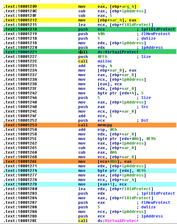 - Finally, in the address space between 0x10001274 – 0x1000127D (marked in blue) the writing of the Jump address (stored in the variable – var_4) is performed in place of the original code segment that appears at the beginning of the send function.