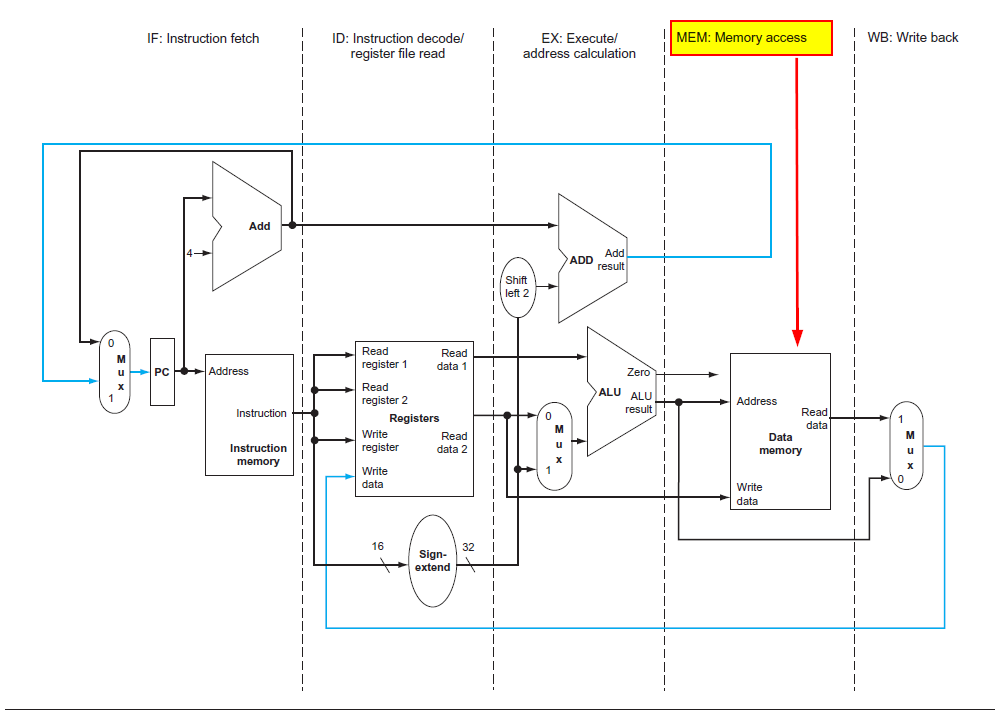 The pipeline is divided into five stages: Fetch, Decode, Execute, Memory, Write-Back.
