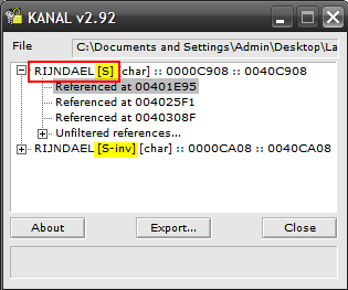 Additionally, we can see the scan detected the use of an S-box structure implemented in various encryption algorithms (displayed as [S] and [S-inv] in the screenshot):