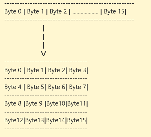 - The algorithm essentially takes 16 bytes (128 bits), arranges them in a 4×4 grid, and performs operations of:
