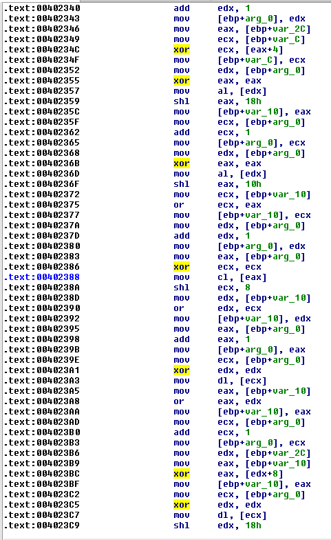 We’ll ignore all commands that belong to functions related to Windows API libraries and commands where register cleanup is performed, namely commands in the form: xor eax,eax.