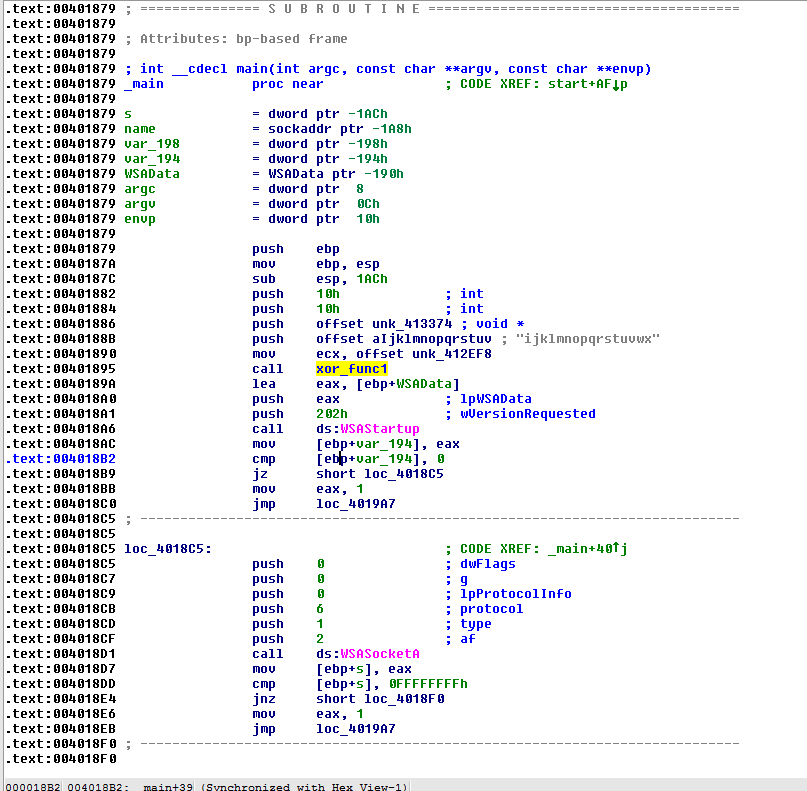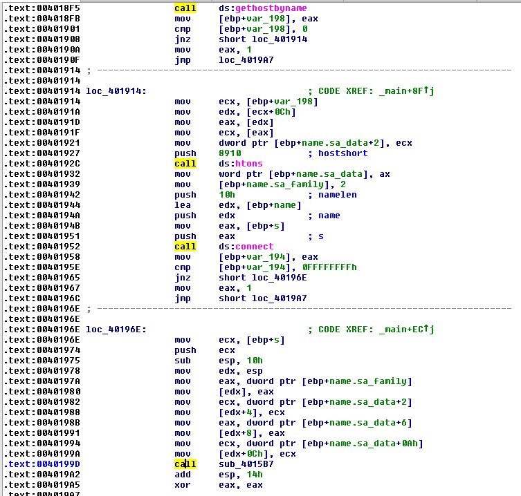 After that, we saw API functions calls to WSAStartup and WSASocketA whose purpose is to perform initialization for a network connection.
