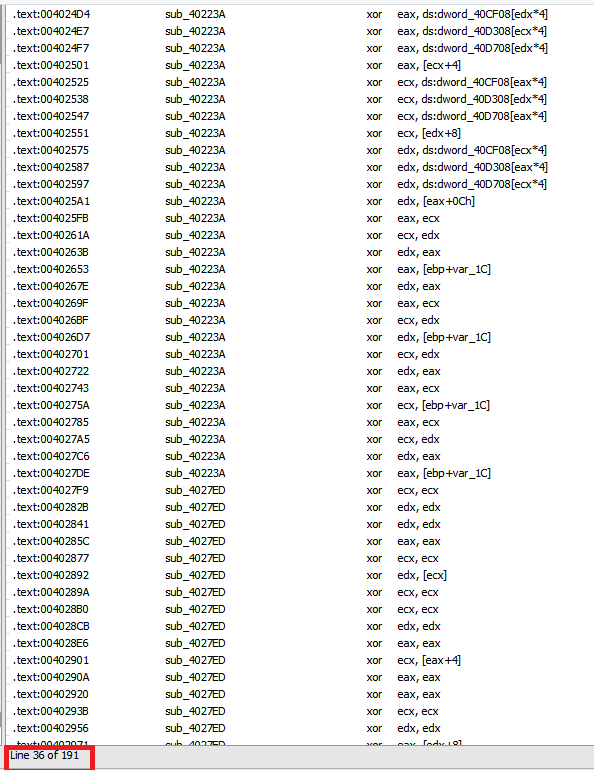 Running a search for all the XOR commands existing in our assembly code, we see that there are quite a few: