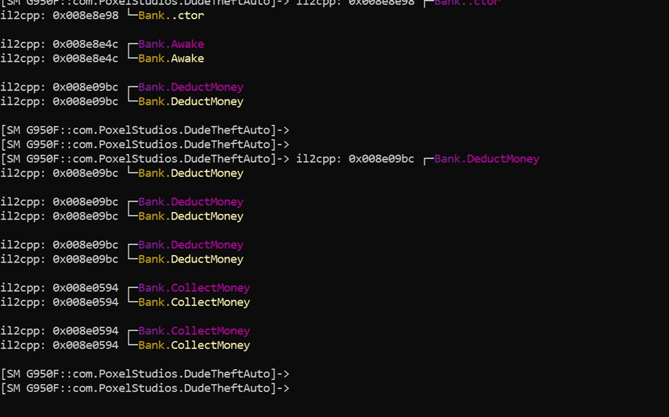 Frida –U –f com.PoxelStudios.DudeTheftAuto –l HookUnity.js