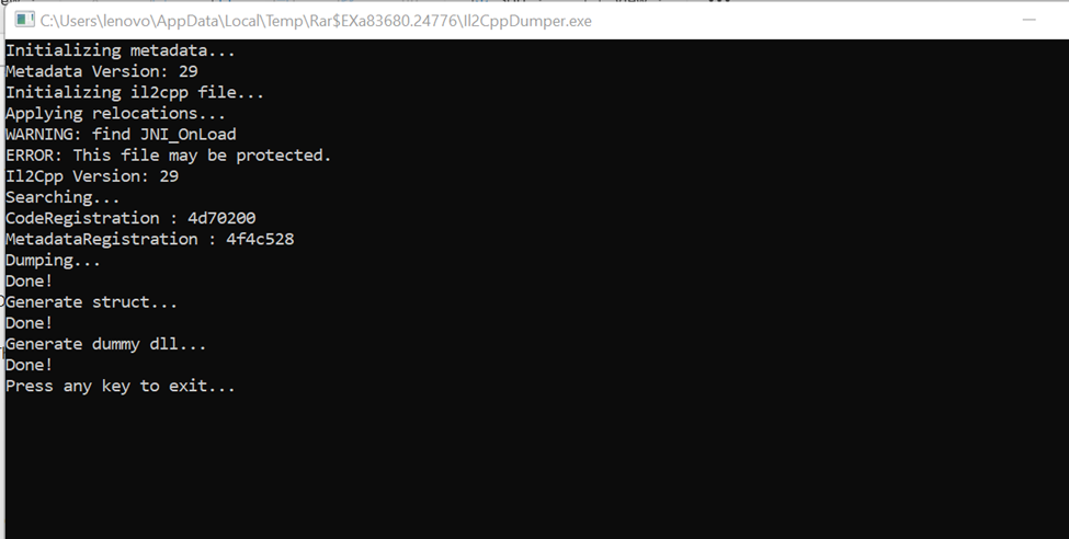 You can find a folder named “DummyDLL” in the path the Il2cppdumper exists. If you find dumped dlls there, then move to the next section about static analysis using Dnspy.