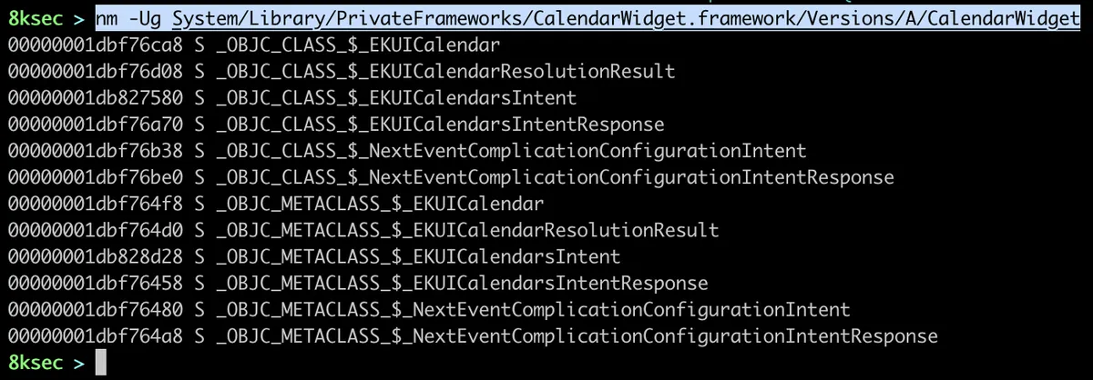We can see a lot of interesting directories such as PrivateFrameworks and Frameworks. We can now, for example, see the exported symbols from one of this frameworks, let’s say CalendarWidget.framework using nm -Ug followed by the path to the CalendarWidget shared library.