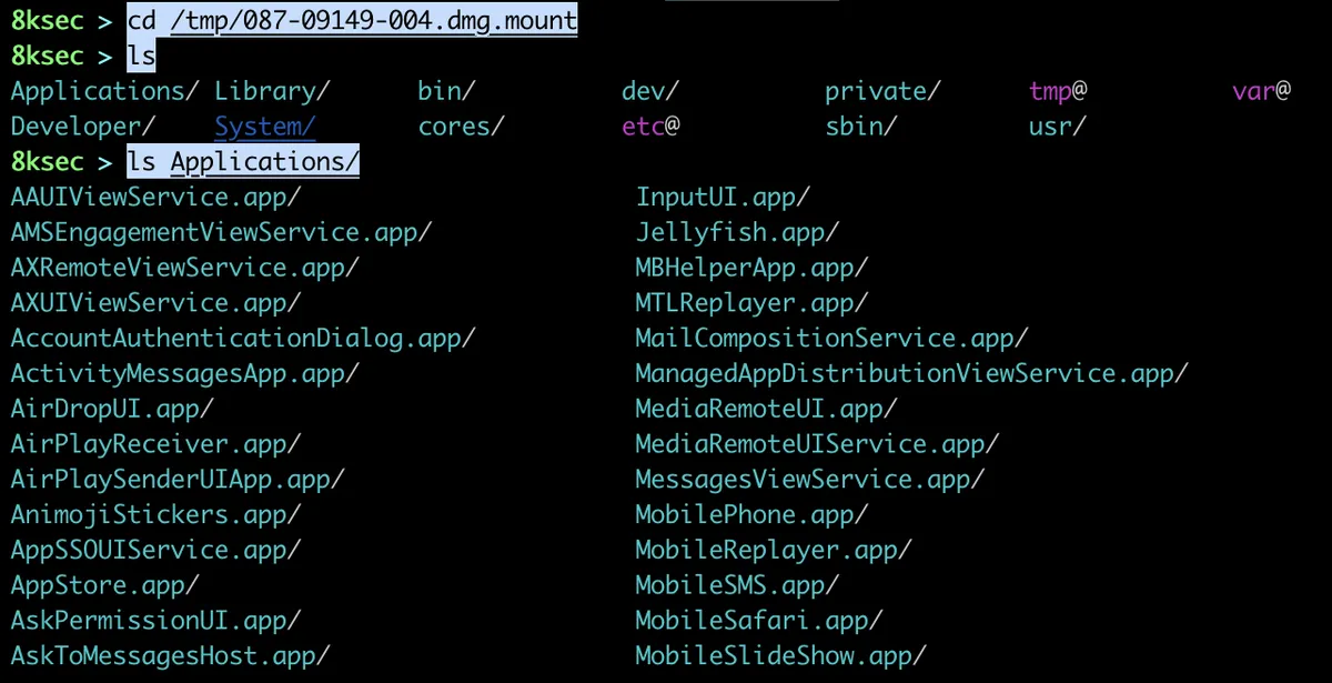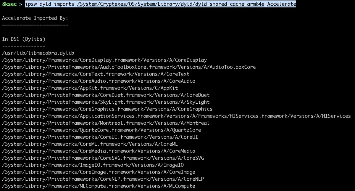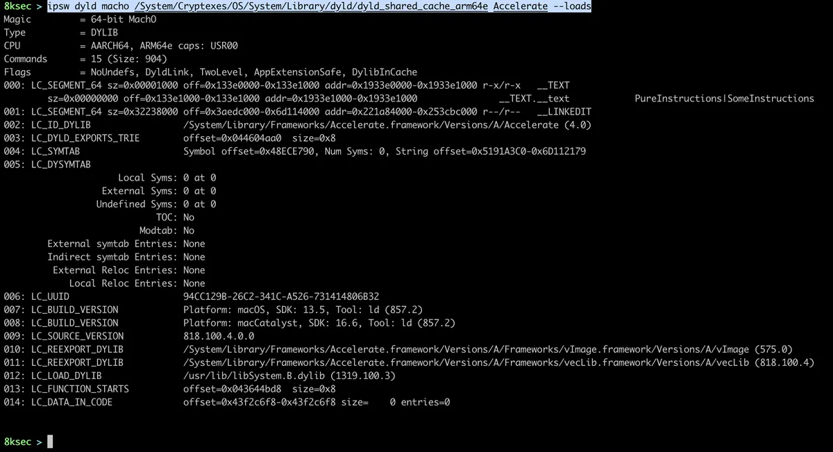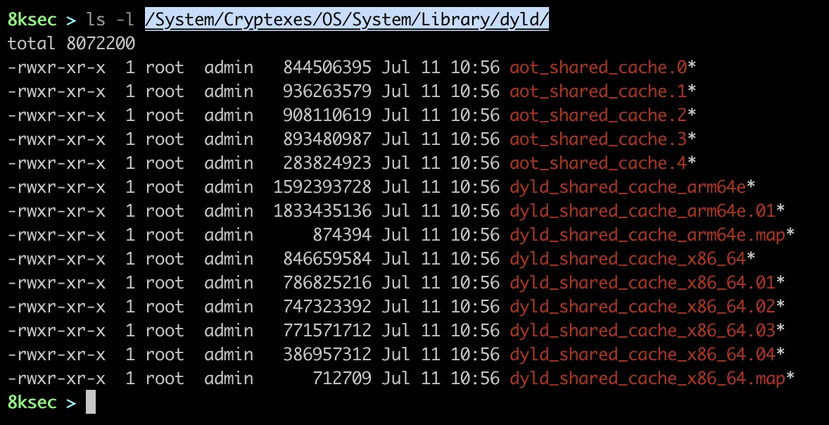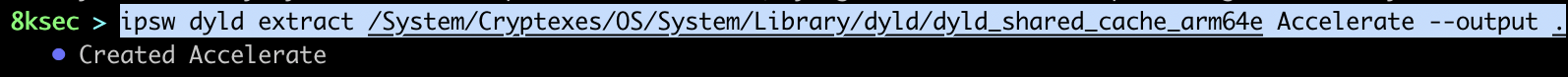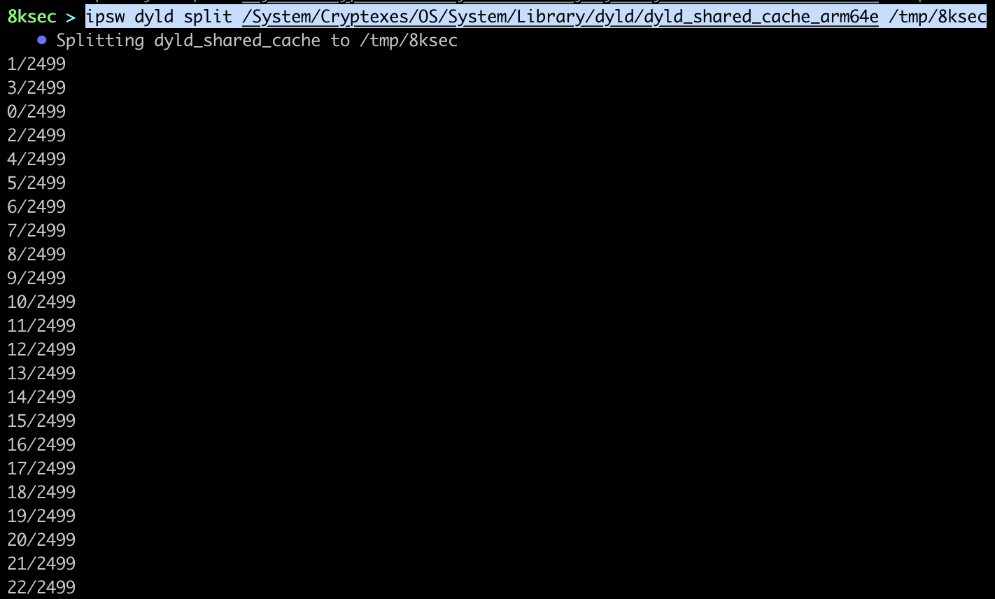 command: ipsw dyld split /System/Cryptexes/Os/System/Library/dyld/dyld_shared_cache_arm64e /tmp/8ksec.