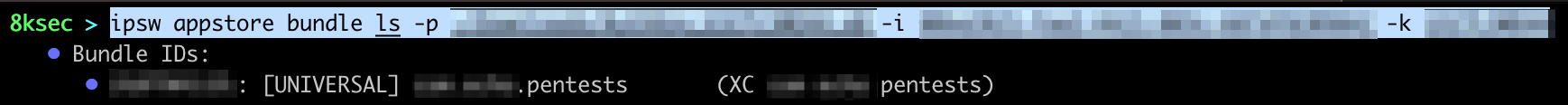 We can list registered bundle IDs (created with Xcode) using ipsw appstore bundle ls while providing previously acquired information (.p8 file, Issuer ID and Key ID). We could use this command in order to see all the bundle IDs that we have registered.