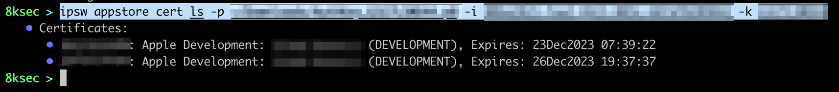 appstore provides us with the management of signing certificates. To list the certificates we can simply call ipsw appstore cert ls with the .p8 file, Issuer ID and Key ID. We can use this command in the cases where we would want to quickly create new signing certificate or if we want to check them.