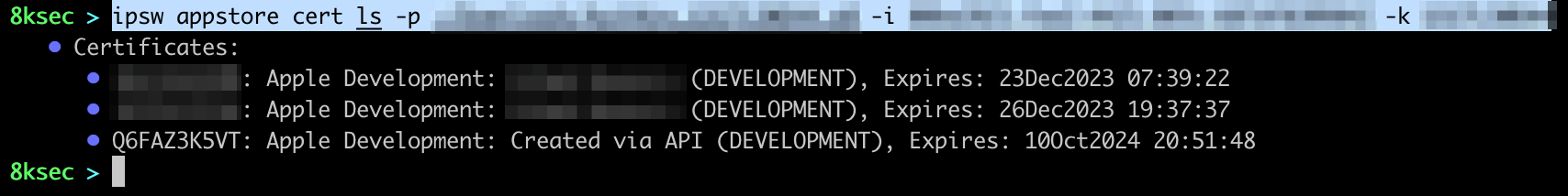 command: ipsw appstore cert ls -p PATH_TO_P8_FILE -i ISSUER_ID -k KEY_ID