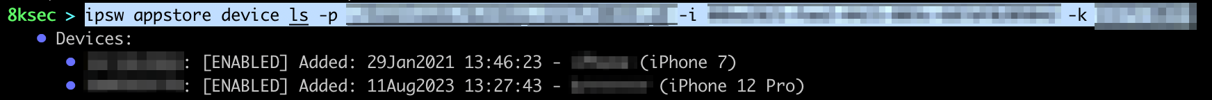 To list the devices command is ipsw appstore device ls -p PATH_TO_P8_FILE -i ISSUER_ID -k KEY_ID