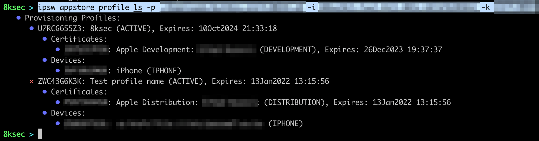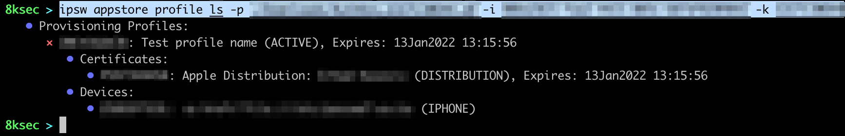 command: ipsw appstore profile rm -n 8ksec -p PATH_TO_P8_FILE -i ISSUER_ID -k KEY_ID