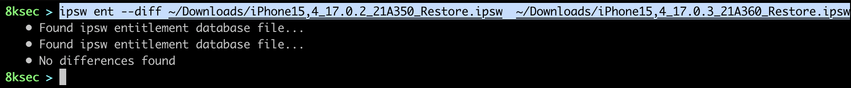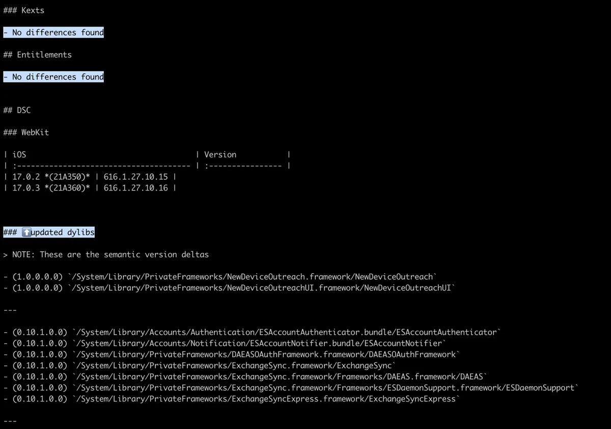 command: ipsw diff ~/Downloads/iPhone15,4_17.0.2_21A350_Restore.ipsw ~/Downloads/iPhone15,4_17.0.3_21A360_Restore.ipsw