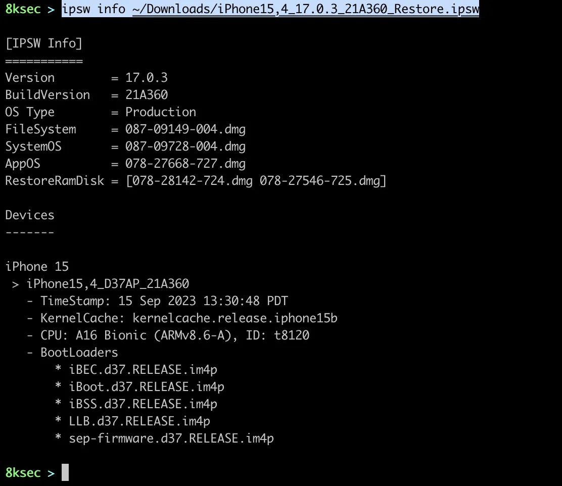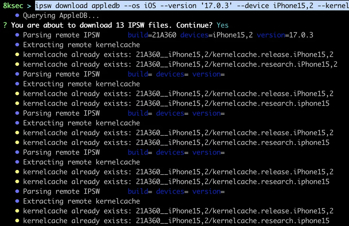 command: ipsw download appledb --os iOS --version '17.0.3' --device iPhone15,2 --kernel