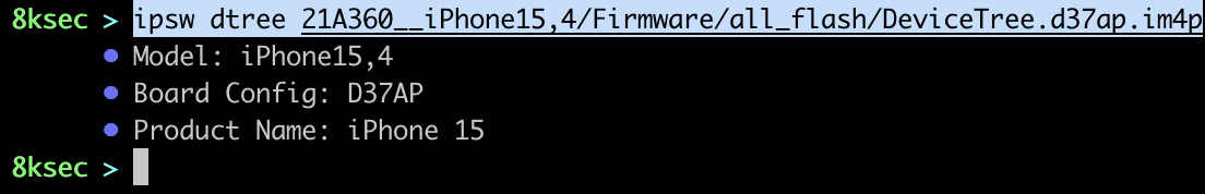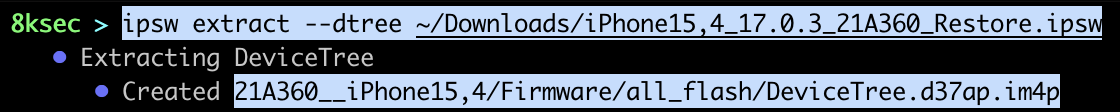 To parse DeviceTree, we first need to have one and to do that, we can use ipsw extract to extract DeviceTree from the IPSW file.