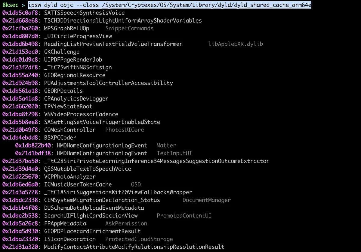 To dump all the classes, we can use ipsw dyld objc —class PATH_TO_DYLD_SHARED_CACHE