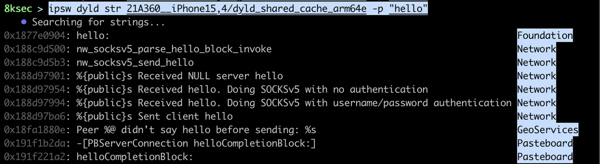 ipsw dyld str allows us to search for specific string patterns inside of dyld_shared_cache files. This comes in handy when we want to check for example where is the specific string used/referenced.