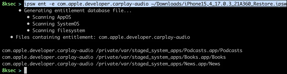 command: ipsw ent -e com.apple.developer.carplay-audio PATH_TO_IPSW_FILE