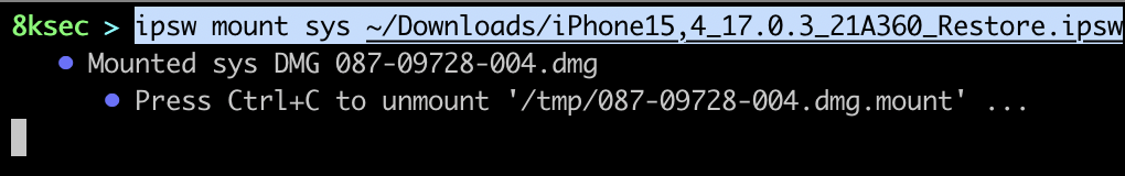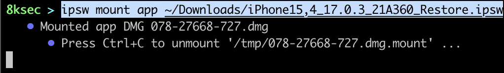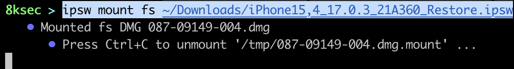 ipsw mount command allows us to mount the specific part of IPSW file. Those parts are fs (filesystem), sys (system) or app (library). We may want to use this command if we would like to see what is exactly inside of IPSW file and to do some further analysis/research on the specific part of it, e.g. specific dylib.